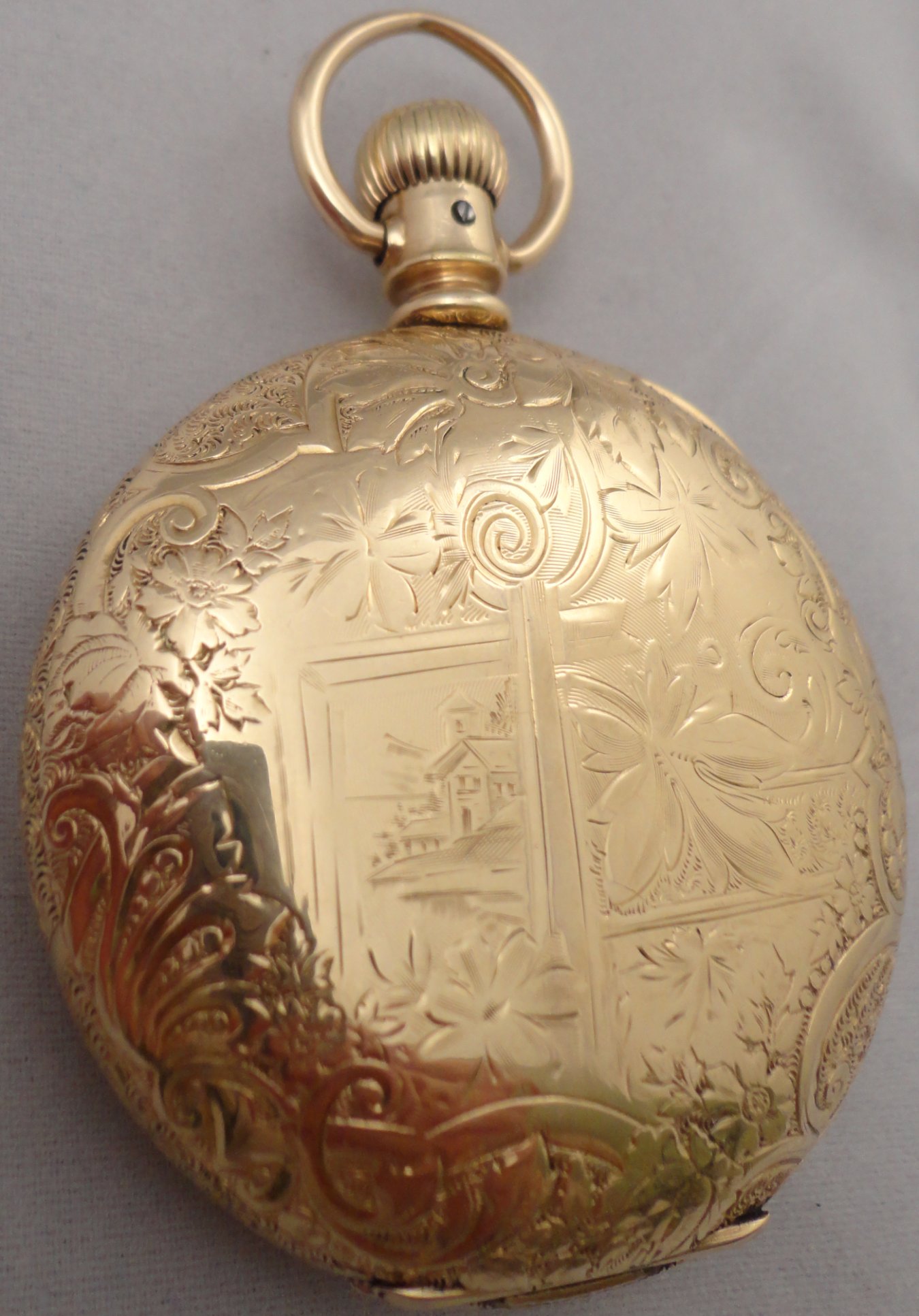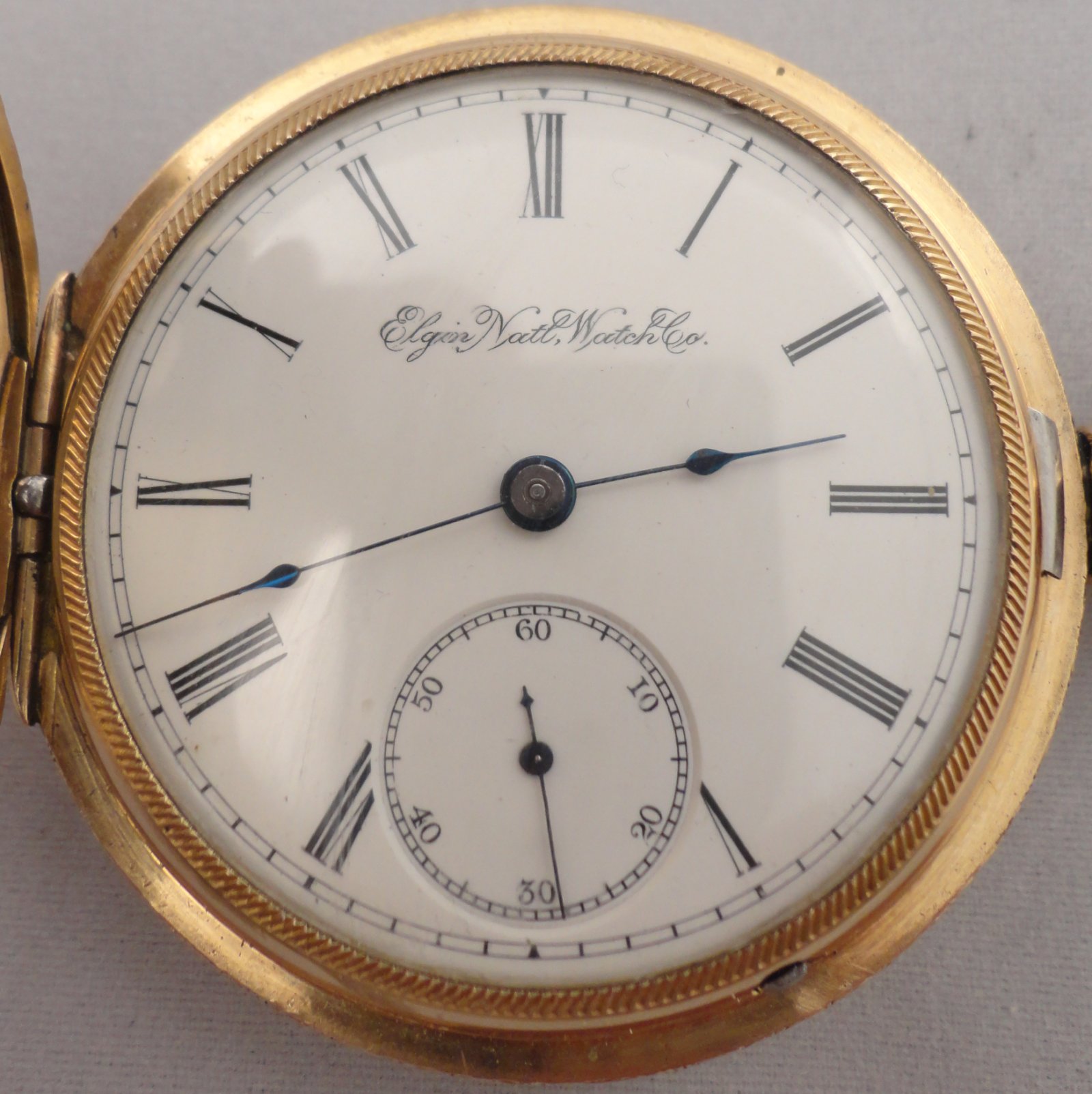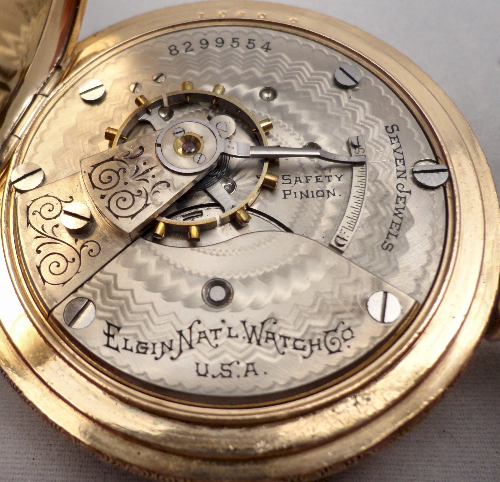THIS ITEM IS SOLD Antique Elgin RG keyless full hunter pocket watch Circa 1920. Working order. This very nice all over engraved, large size, gold plated or rolled gold case, is in very good condition. The keyless wind full plate movement with lever esacpement is numbered and marked, Elgin Nat'l Watch Co. U.S.A. Seven Jewels. and Safety Pinion. The enamel dial is signed Elgin Nat'l Watch Co, the dial is perfect. There are no personal inscriptions on the watches outer case, there is a presentation inscription on the inner movement cover. Dims; 55mm diameter, 79mm long, 18mm thick. Our ref 646 ID Number: 646 Enquire about this item  |