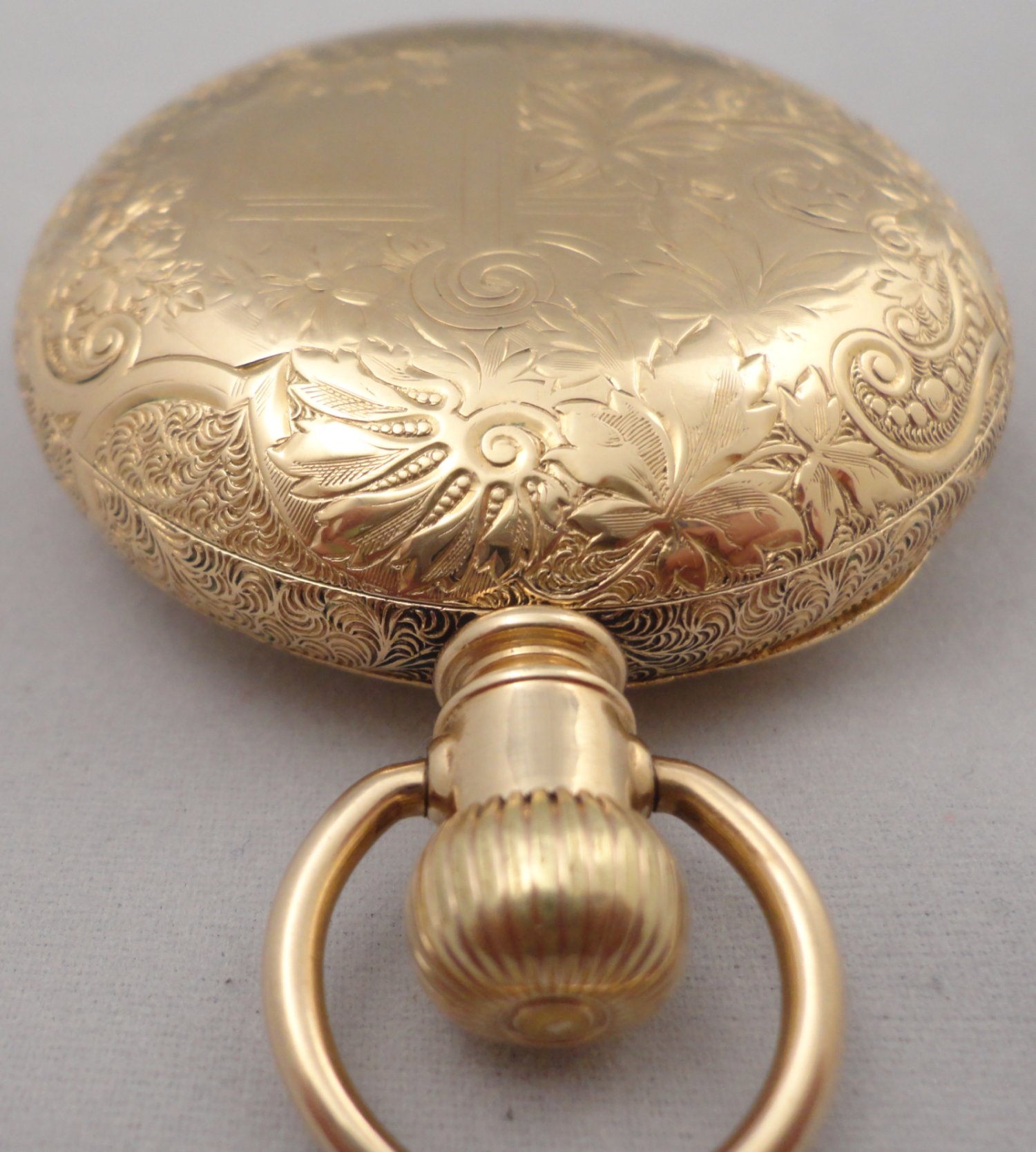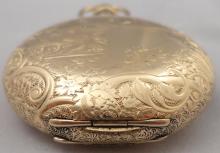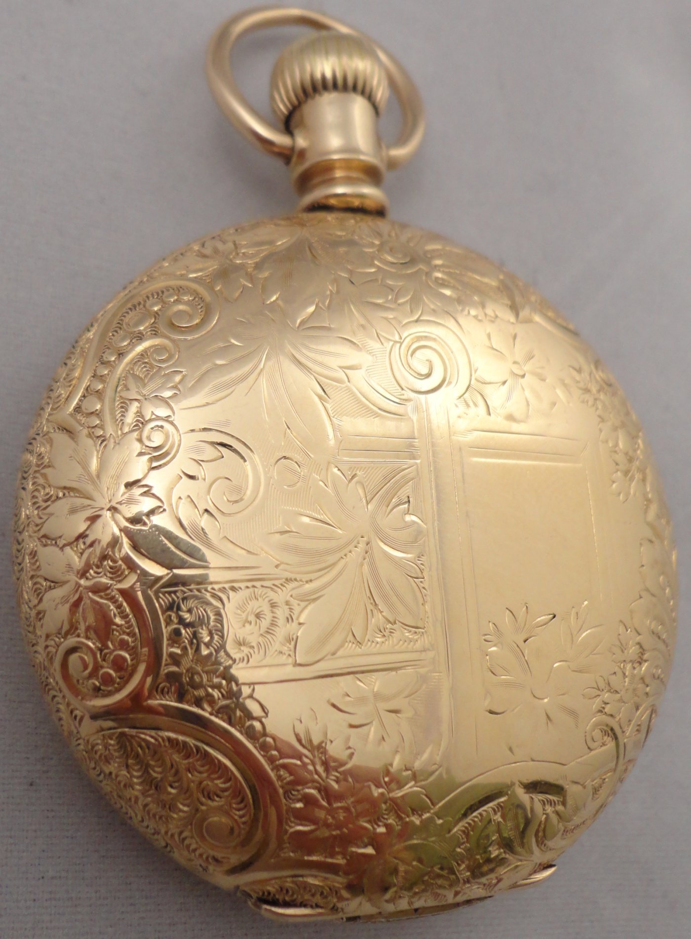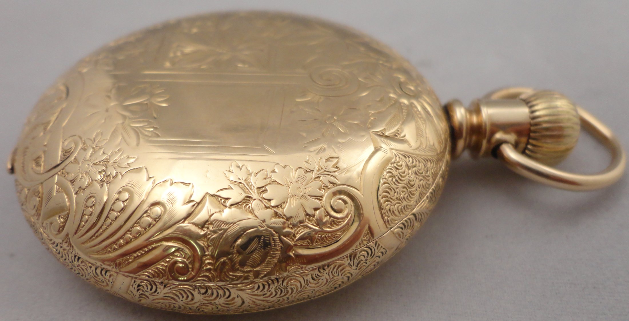 THIS ITEM IS SOLD Antique Elgin RG keyless full hunter pocket watch Circa 1920. Working order. This very nice all over engraved, large size, gold plated or rolled gold case, is in very good condition. The keyless wind full plate movement with lever esacpement is numbered and marked, Elgin Nat'l Watch Co. U.S.A. Seven Jewels. and Safety Pinion. The enamel dial is signed Elgin Nat'l Watch Co, the dial is perfect. There are no personal inscriptions on the watches outer case, there is a presentation inscription on the inner movement cover. Dims; 55mm diameter, 79mm long, 18mm thick. Our ref 646 ID Number: 646 Enquire about this item  |