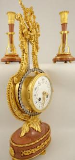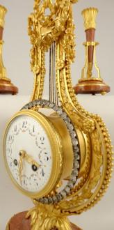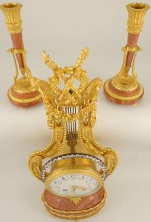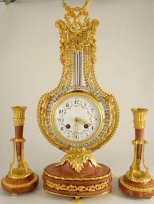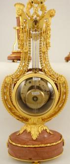 Antique French ormolu lyre clock garniture with swinging paste set pendulum