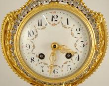 8-Day movement with anchor escapement striking the hour and half hour on a bell. The five rod grid-iron pendulum with knife edge suspension hung from the top and connected to a ring set with brilliants surrounding the dial with a counter balance behind in front of the bell, the whole pendulum swinging from side to side.