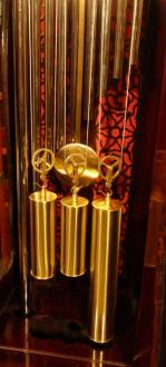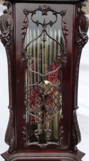 Eight day three train weight driven movement chiming the quarters on eight tubular bells and the hour on a further tube, driven by three brass sleeved weights and regulated by the brass pendulum.