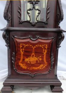 The two tier hood with serpentine shaped, carved, door, marquetry inlay and two carved finials.