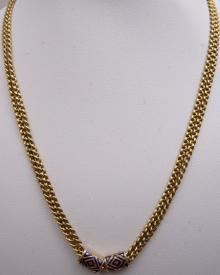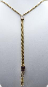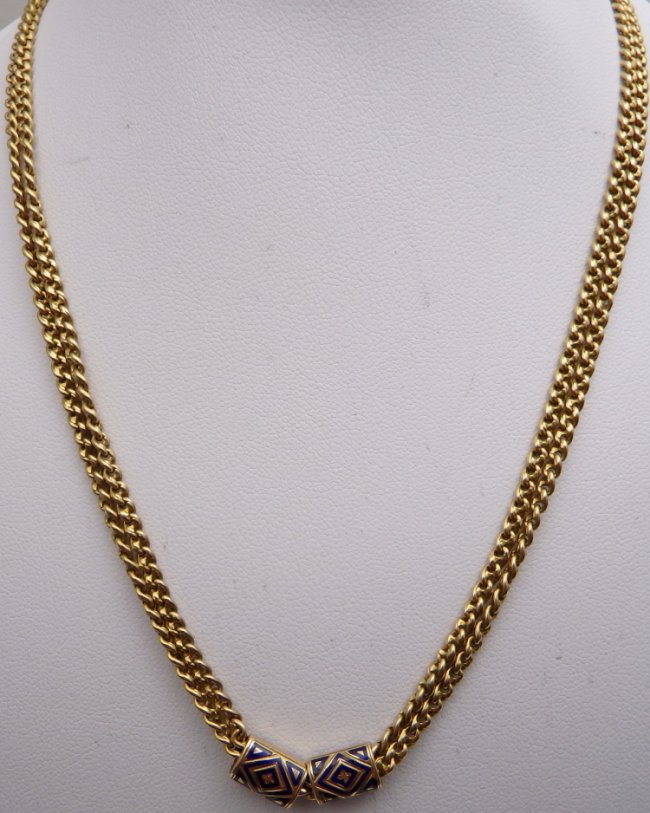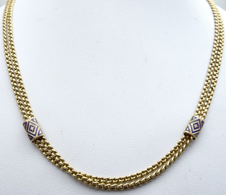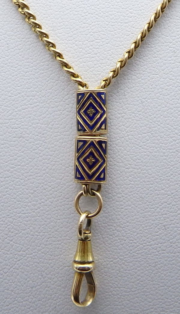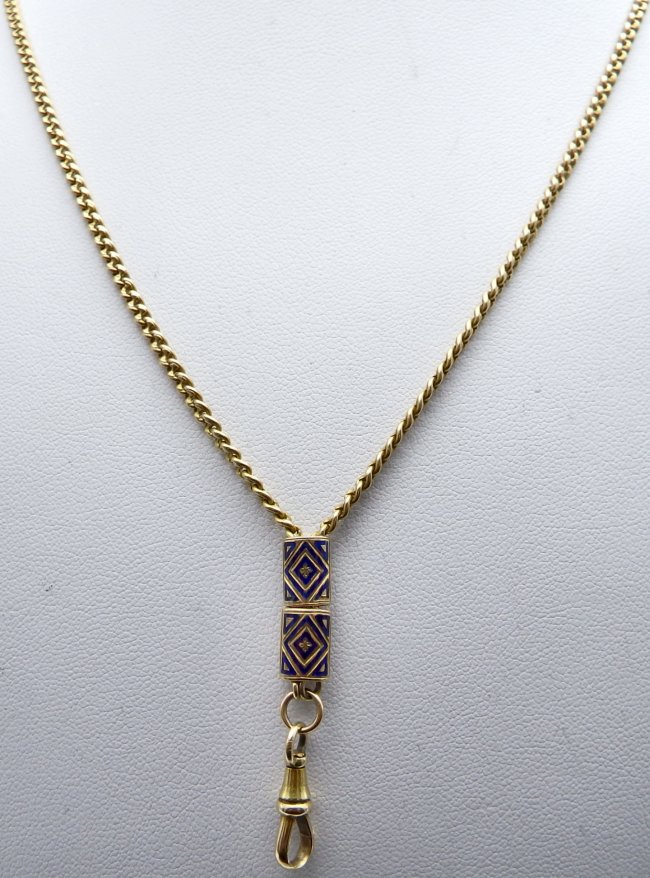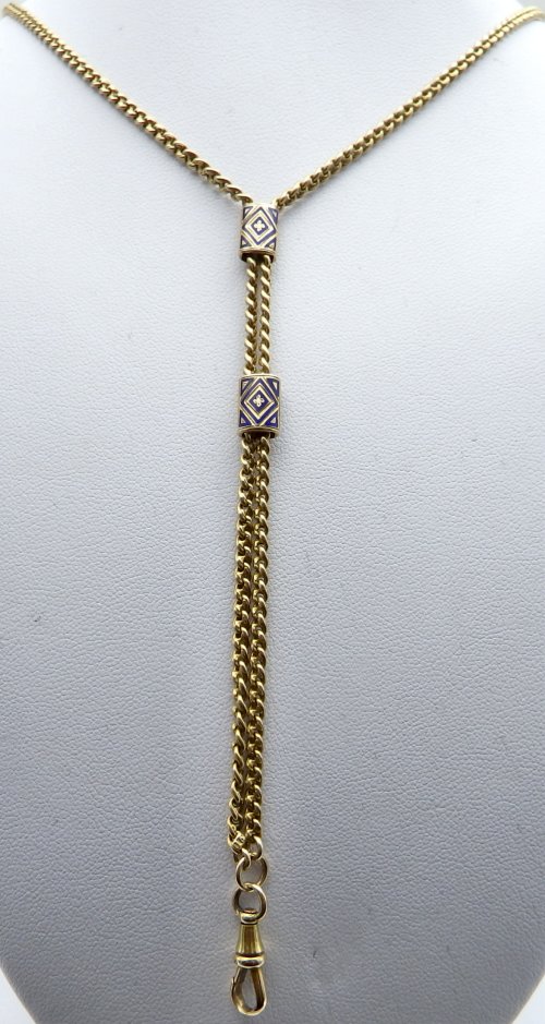 THIS ITEM IS SOLD Antique 31 inch 15ct gold muff guard long chain necklace with enamelled sliders. Weighs 22.7 grams. This nice quality yellow gold guard chain is in nice condition, it has been cleaned and is ready to wear. The Victorian chain can be worn in a variety of ways, see pictures. The 2 sliders move the length of the chain, so can be positioned wherever wanted. The large circular spring clip can be removed, or when its attached to the dog clip it makes a double chain necklace 16.75 inches long. When worn as a single chain it is 32 inches long, not counting the dog clip suspension. The Victorian chain is marked with the 15ct antique gold tag mark and it has been fully tested as 15 carat. The links are approx 2.6mm wide and 1.6mm thick. The dog clip for a pendant, locket or watch has a good spring action and closes fully. Our ref 3977 All our jewellery has been cleaned and is ready to wear. FREE fully insured delivery within the U.K. by Post Office next day signed for Special Delivery. FREE worldwide insured shipping with this item. ID Number: 3977 Enquire about this item |