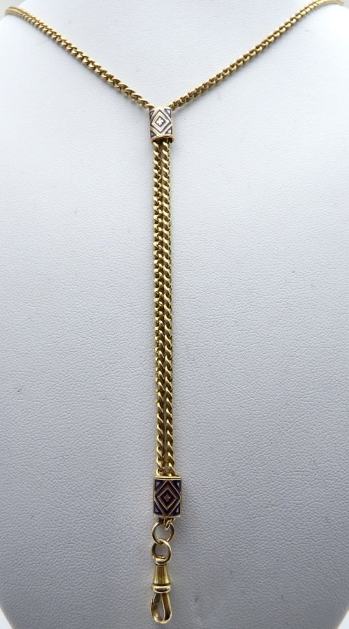 Antique 31 inch 15ct gold muff guard long chain necklace with enamelled sliders.