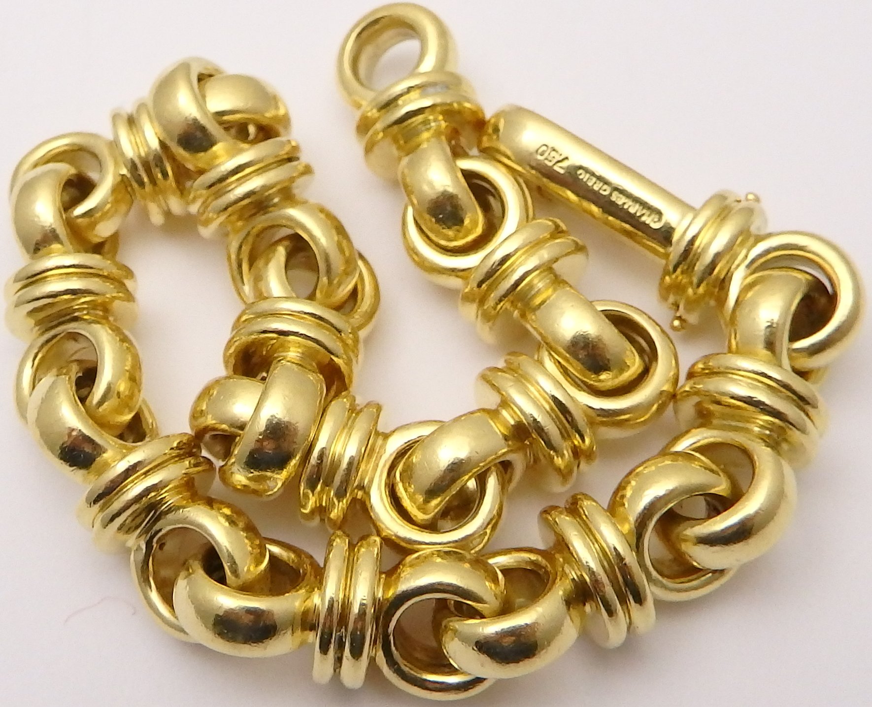 THIS ITEM IS SOLD Heavy 18ct. 105 gram solid yellow gold vintage bracelet 8.75inches long (closed). A substantial sold link uni-sex chain bracelet. Marked on the large clip with the makers mark, Charles Greig and 750 for the 18ct gold purity content. Charles Greig is a Fifth Generation Jewellers Established 1899 in Johannesburg and Cape Town, South Africa. The double links are approx 2.1cm long and 1cm wide, the gauge of the links are 2.6mm thick. In very nice condition. Cleaned and ready to wear. Our ref 4526 All our jewellery has been cleaned and is ready to wear. Not re-polished unless listed as such. FREE fully insured delivery within the U.K. by Post Office next day signed for Special Delivery. FREE worldwide insured shipping with this item. ID Number: 4526 Enquire about this item |