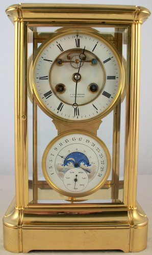 THIS ITEM IS SOLD Circa 1860. Rare small size Gorge case with bevelled glazed panels. Enamel clock dial with visible escapement . Calendar dial with moonphase aperture. Subsidiary dial for days of the week. Outer date ring with fly back date hand, 8-Day movement with compensated pendulum striking on a bell. In full working order. ID Number: 3125 Enquire about this item |