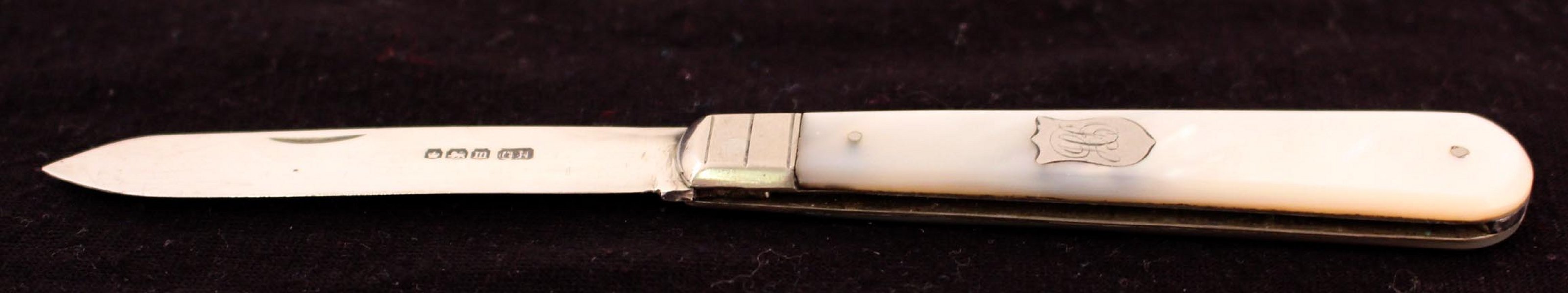Antique silver pocket fruit knife with mother of pearl handle. Hallmarked 1929