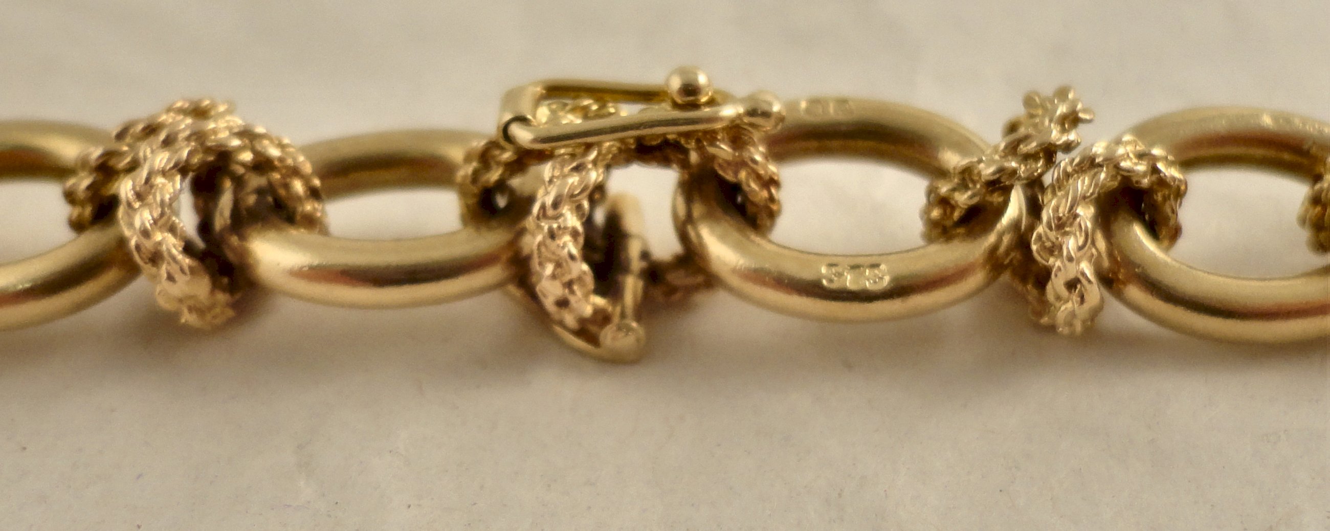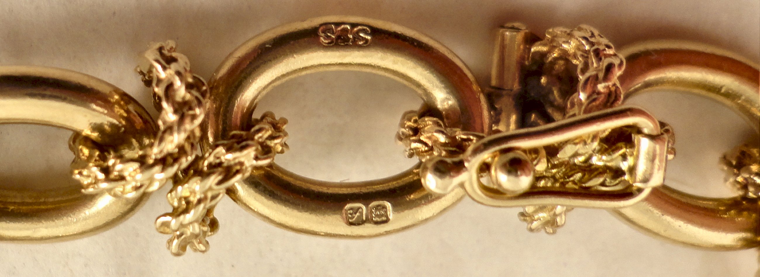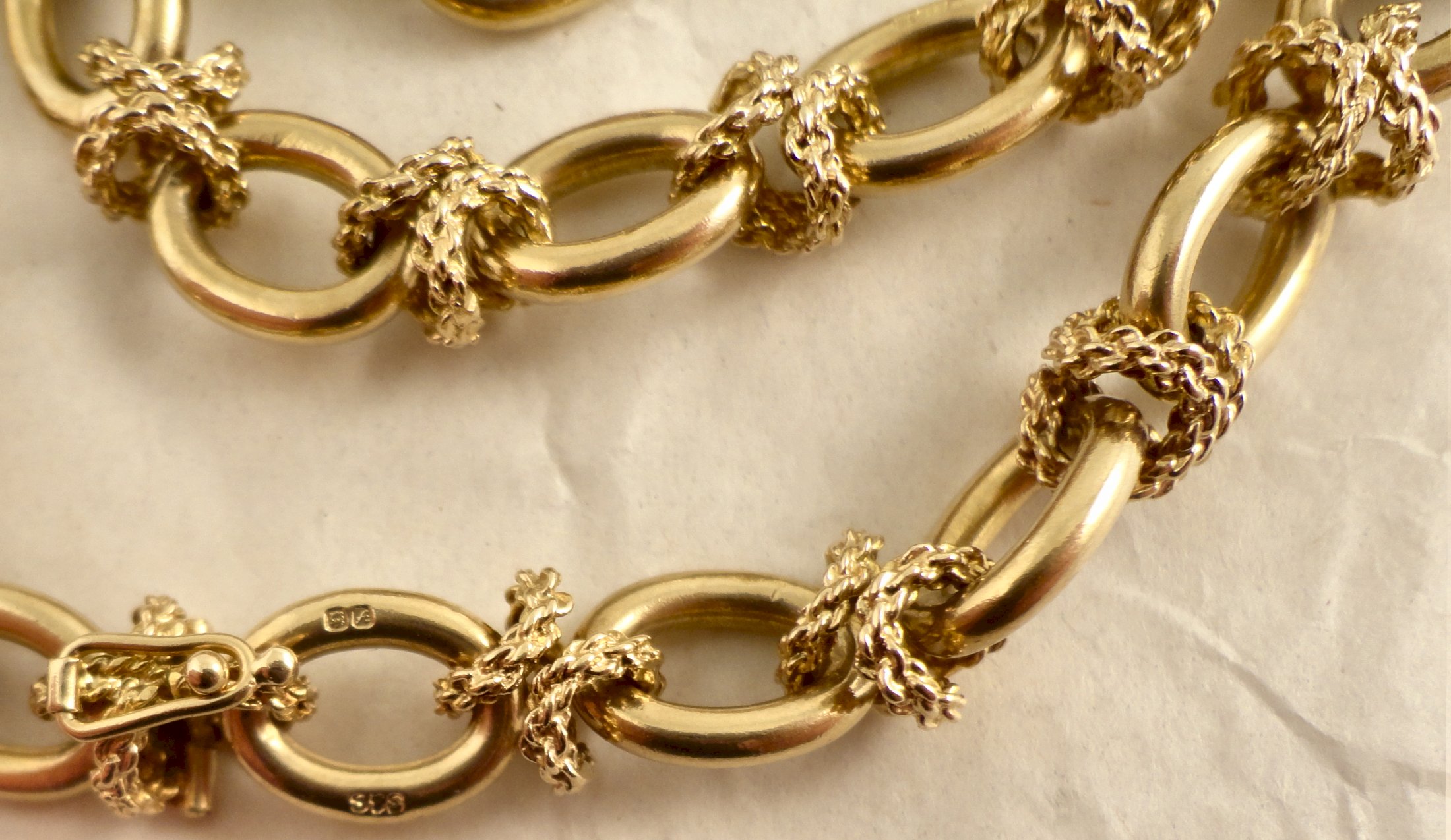 THIS ITEM IS SOLD A high quality, three and a half ounce, 9ct gold neck chain. Hallmarked 375 for 9ct gold in London in 1975 it was made by, Saunders Shepherd & CO. Each plain oval link is joined with textured cross shaped links, one of these forming the hidden box catch that also has a safety catch. The chain is 77cm / 30.25 inches long and weighs 111.2 grams. The plain links of the chain measure 12.45mm long and 9.1mm wide the links are 2.37mm thick. Our ref 496 ID Number: 496 Enquire about this item |
