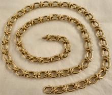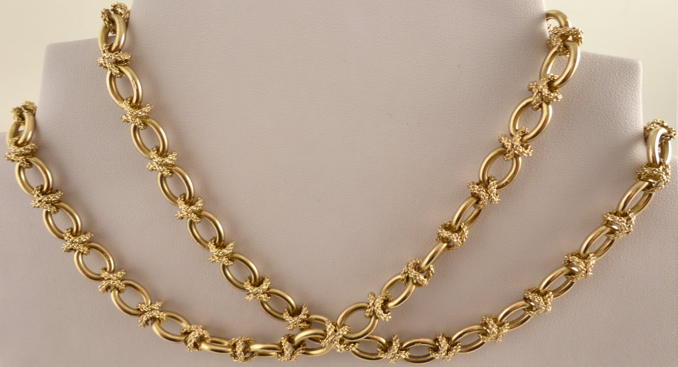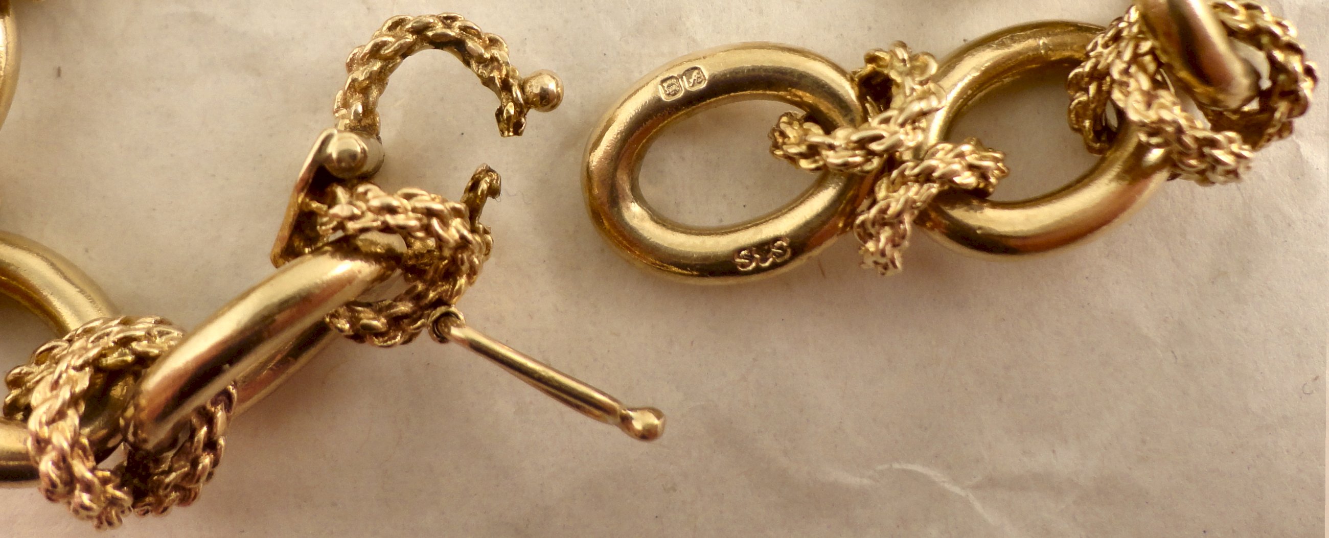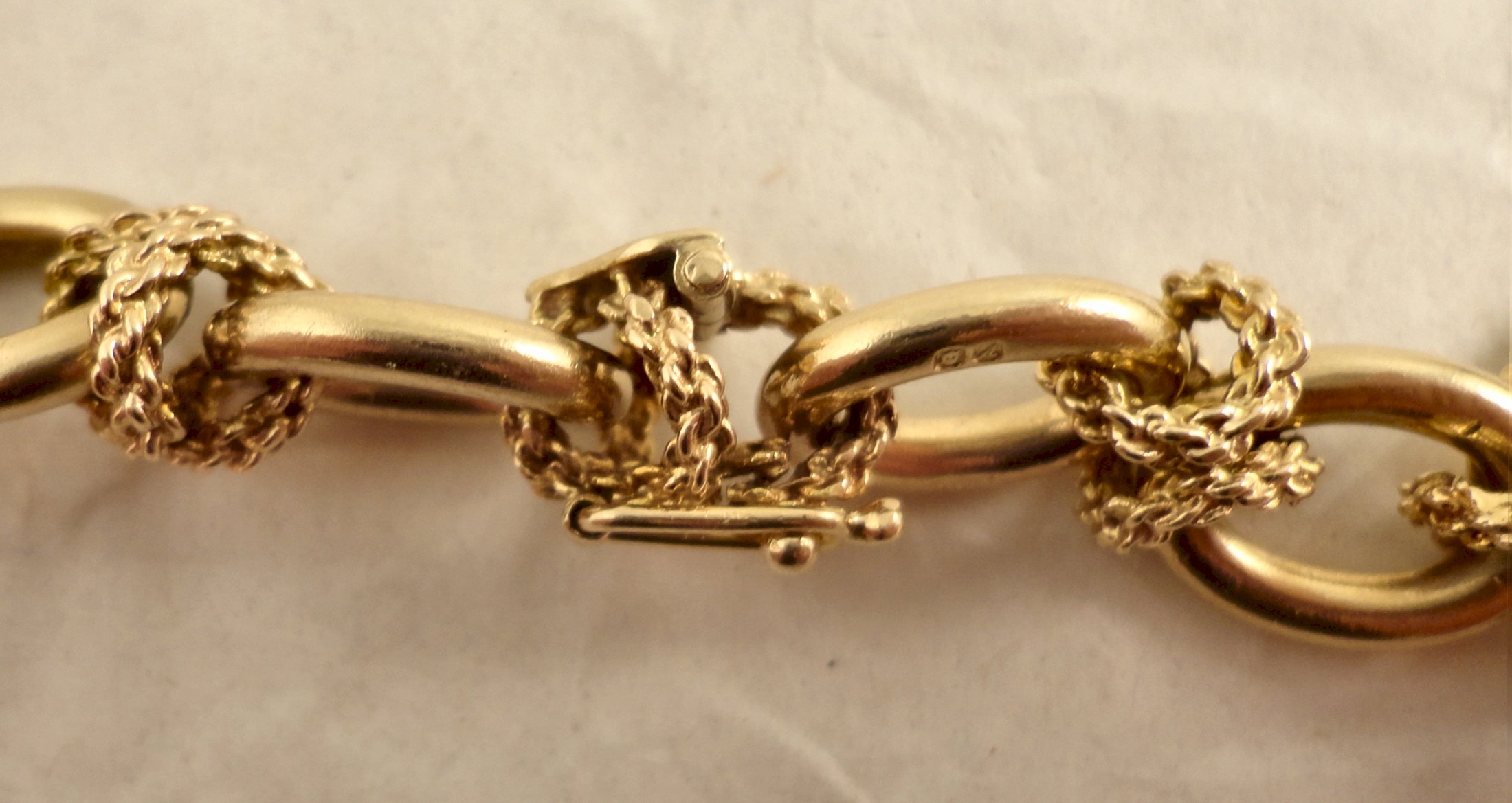THIS ITEM IS SOLD A high quality, three and a half ounce, 9ct gold neck chain. Hallmarked 375 for 9ct gold in London in 1975 it was made by, Saunders Shepherd & CO. Each plain oval link is joined with textured cross shaped links, one of these forming the hidden box catch that also has a safety catch. The chain is 77cm / 30.25 inches long and weighs 111.2 grams. The plain links of the chain measure 12.45mm long and 9.1mm wide the links are 2.37mm thick. Our ref 496 ID Number: 496 Enquire about this item |