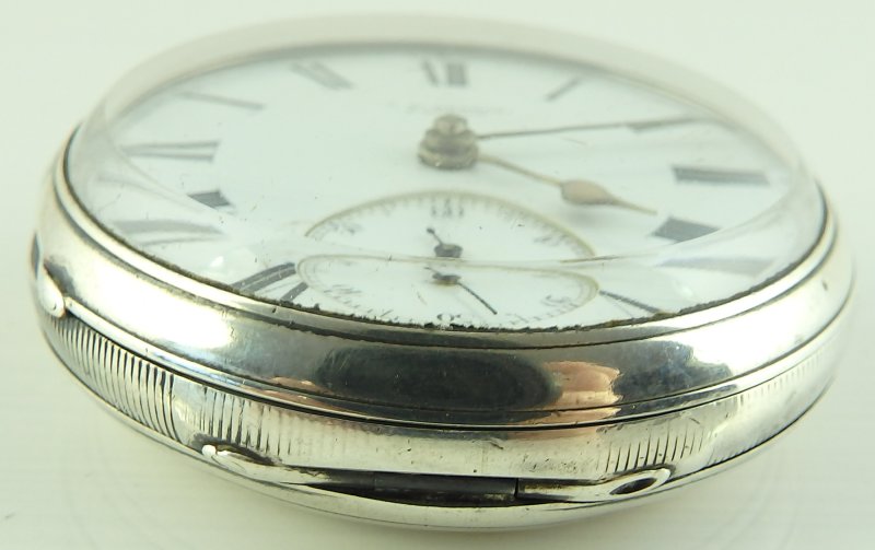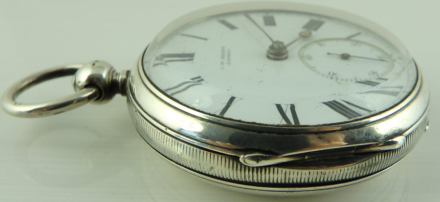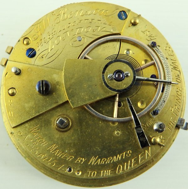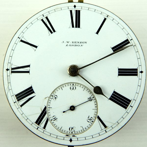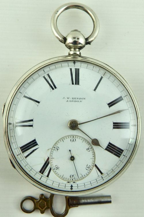 THIS ITEM IS SOLD JW Benson London Antique Victorian silver fusee pocket watch In good working order. The fusee chain drive movement with lever escapement signed, J. W. Benson, 62 & 64 Ludgate Hill, London. Watchmaker by Warrants to The Queen and The Prince of Wales. Numbered 36054 with the same number repeated on the silver case. The case hallmarked London 1880 and also with Bensons J.W.B. mark in an oval punch. The enamel dial with Roman numerals, subsidiary seconds dial and gilt hands. There are some hairlines in the dial around the seconds dial @ 7 and 5. The watch case is 50mm in diameter and 18mm thick over the glass. In good working order, complete with winding key. There are no personal inscriptions on the watch. The hinges are in good condition and the back cover springs open when the stem button is pressed. Our ref 1770 ID Number: 1770 Enquire about this item |