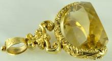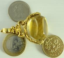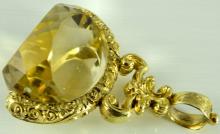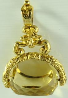 THIS ITEM IS SOLD Large antique yellow gold plated swivel watch fob with faceted citrine, cairngorm stone. The stone is 23mm x 17mm and the fob 4.7cm long. Gross weight 19.7 grams. In nice antique condition. Our ref 1907 ID Number: 1907 Enquire about this item |