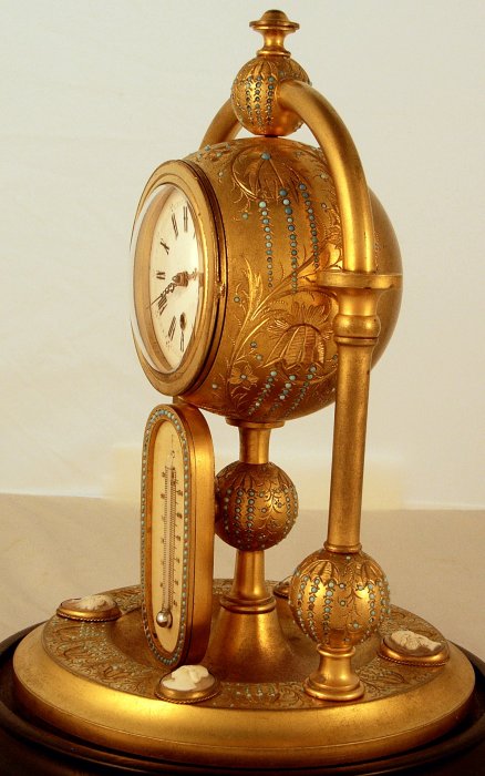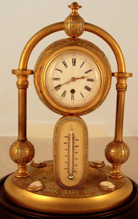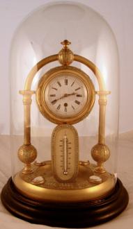 Under a glass dome. Mercury thermometer on an ivory scale. Timepiece movement.