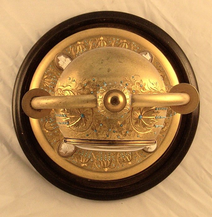 Engraved gilt case set with turquoise and cameos.
