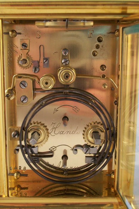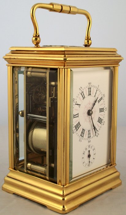 8-Day movement with lever escapement striking the hours and halves on a gong with repeat button and alarm function.