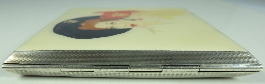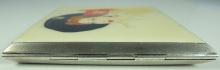 Enamelled front with a portrait of 2 females on a cream background the back and sides with engine turned design.